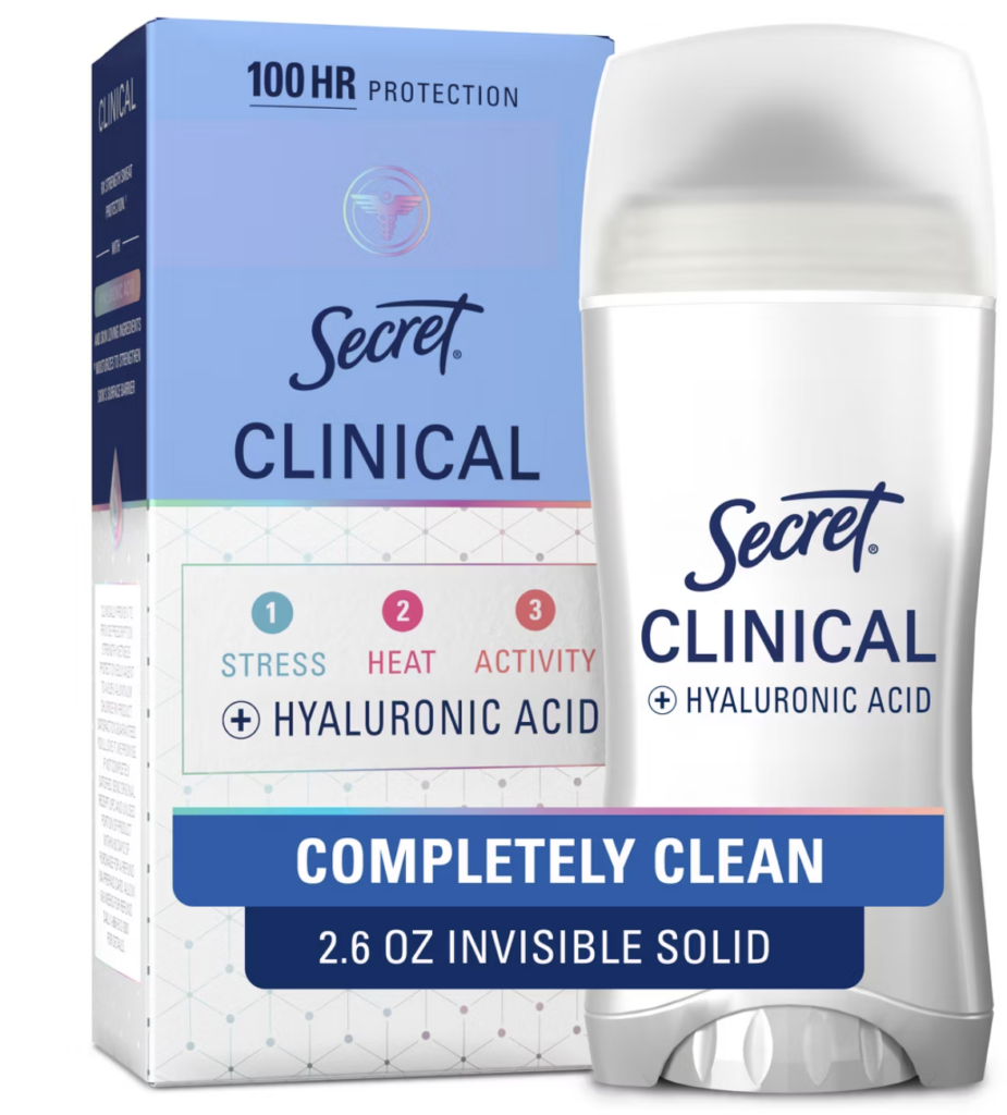 Designed for real life, the new Secret Clinical Hyaluronic Acid Antiperspirant offers clinically proven 100-hour sweat protection against stress, heat, and activity. Its triple-acting formula delivers 3X stress sweat protection compared to ordinary antiperspirants—so you can skip constant reapplication and stay confident no matter what the day brings.